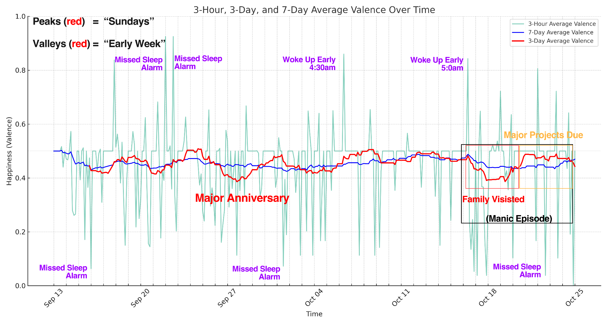 Utilized python, pandas to crosslink Spotify stream history JSON data with Spotify API Song features (mood ‘valence’) to map out longitudinal personal mood.